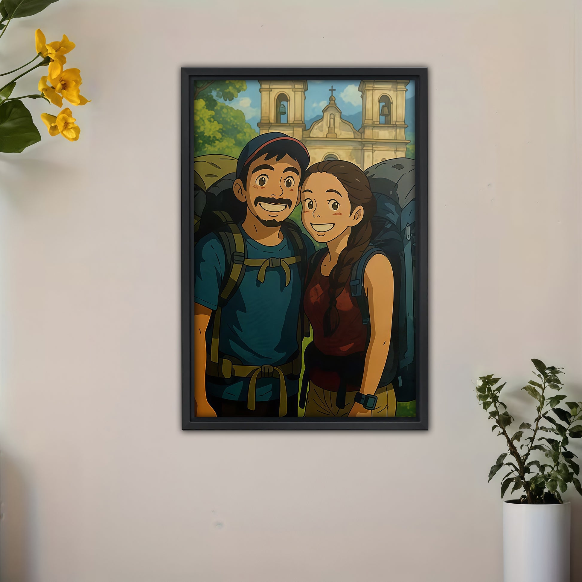 This anime-style custom photo canvas is incredible—they turned our hiking trip pic into something straight out of a Ghibli film! The colors are vibrant, the details (like our backpacks and the church backdrop) are spot-on, and it looks way more high-quality than I expected. It’s now the centerpiece of our living room—10/10, we’ll definitely order another!