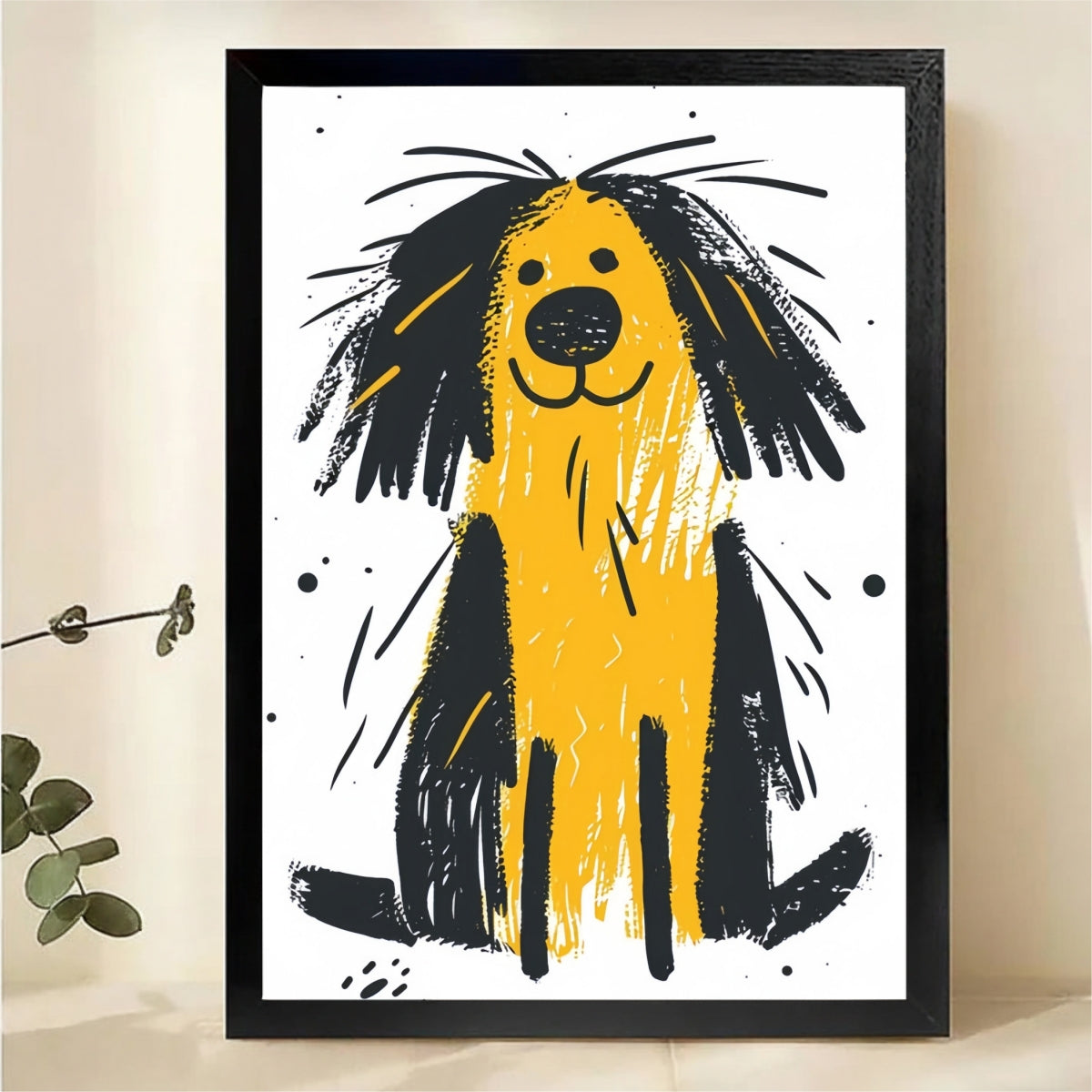 Happy Shaggy Dog Wall Art - Cheerful Yellow Black Print|W1320