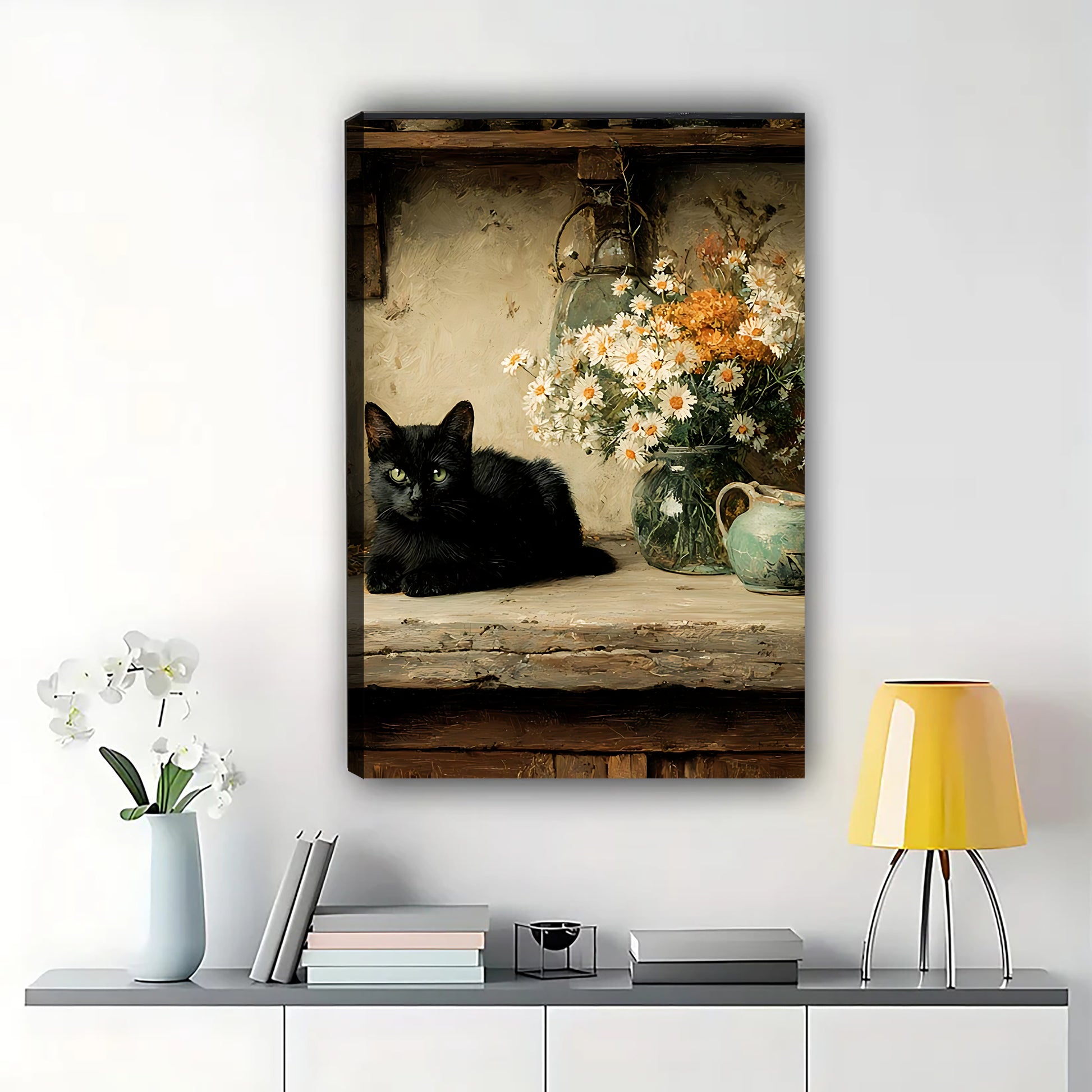 Vintage Black Cat on Wooden Table – Timeless Still Life Wall Art on Natural Wood Canvas | W805