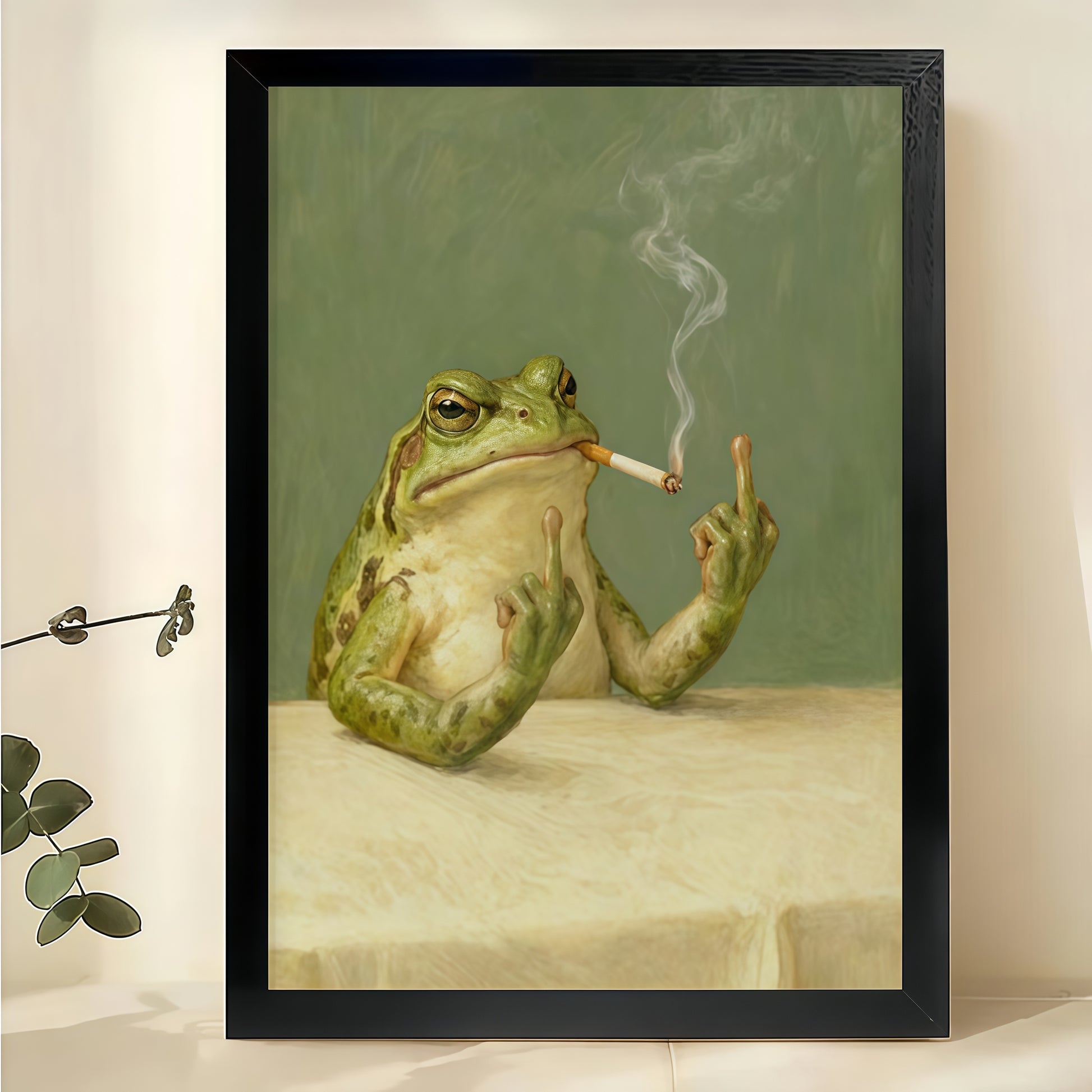 Retro Smoking Frog – Humorous Anthropomorphic Wall Art on Natural Wood Canvas | W808