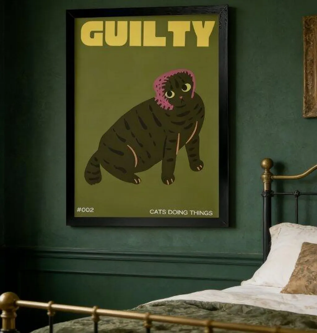 This piece exceeded all my expectations! The bold yellow "GUILTY" text pops so hard against the green background, and the cat’s little guilty face is too cute. The black frame elevates the whole look, and I’ve gotten so many compliments already!